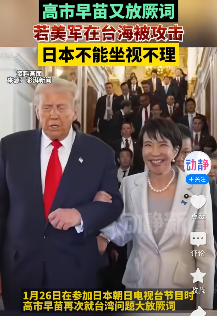 媒日本综合信息报道,1月26日高市在节目访中谈到日本在“台海有事”时的应对情况,大言不惭的称“如果美军在台海危机中遭受攻击,日本必须加入战斗,救援美军和日本的民众,如果日本逃避,美日安全同盟将瓦解,日本必须不计代价维系好美日同盟的关系”。