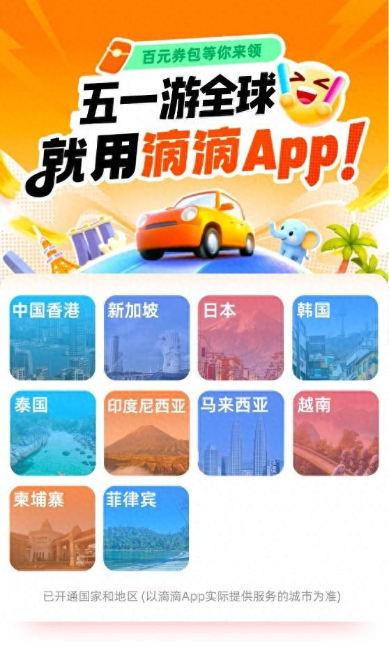 为方便用户“五一”出行,滴滴上线跨境游专属最高价值百元券包。前往中国香港的用户领券后打车享5折优惠。前往新加坡、韩国、泰国等地的用户可领1张5元立减券、1张8折打车券、1张10元满减券和1张15元满减券,优惠不限车型、不限时间和地点,结算时自动为用户减免。