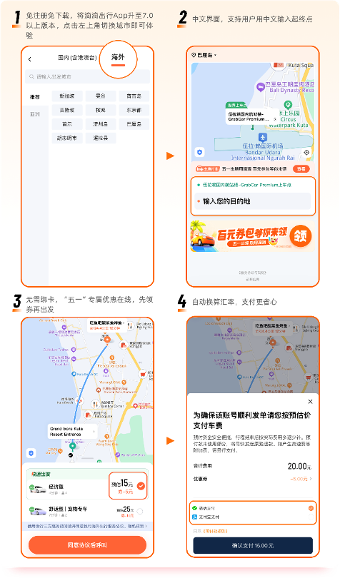 近两年“跨境游”蔚然成风,为满足用户不断升级的跨境漫游需求,目前滴滴已在中国香港地区以及韩国、新加坡、日本、马来西亚、印度尼西亚、越南等 9 个国家的 1200 多个城市提供服务。用户将滴滴出行App更新至7.0以上版本,即可在陌生的城市体验熟悉的滴滴,“五一”期间还上线专属优惠,用户可领最高价值百元券包,打车8折起。